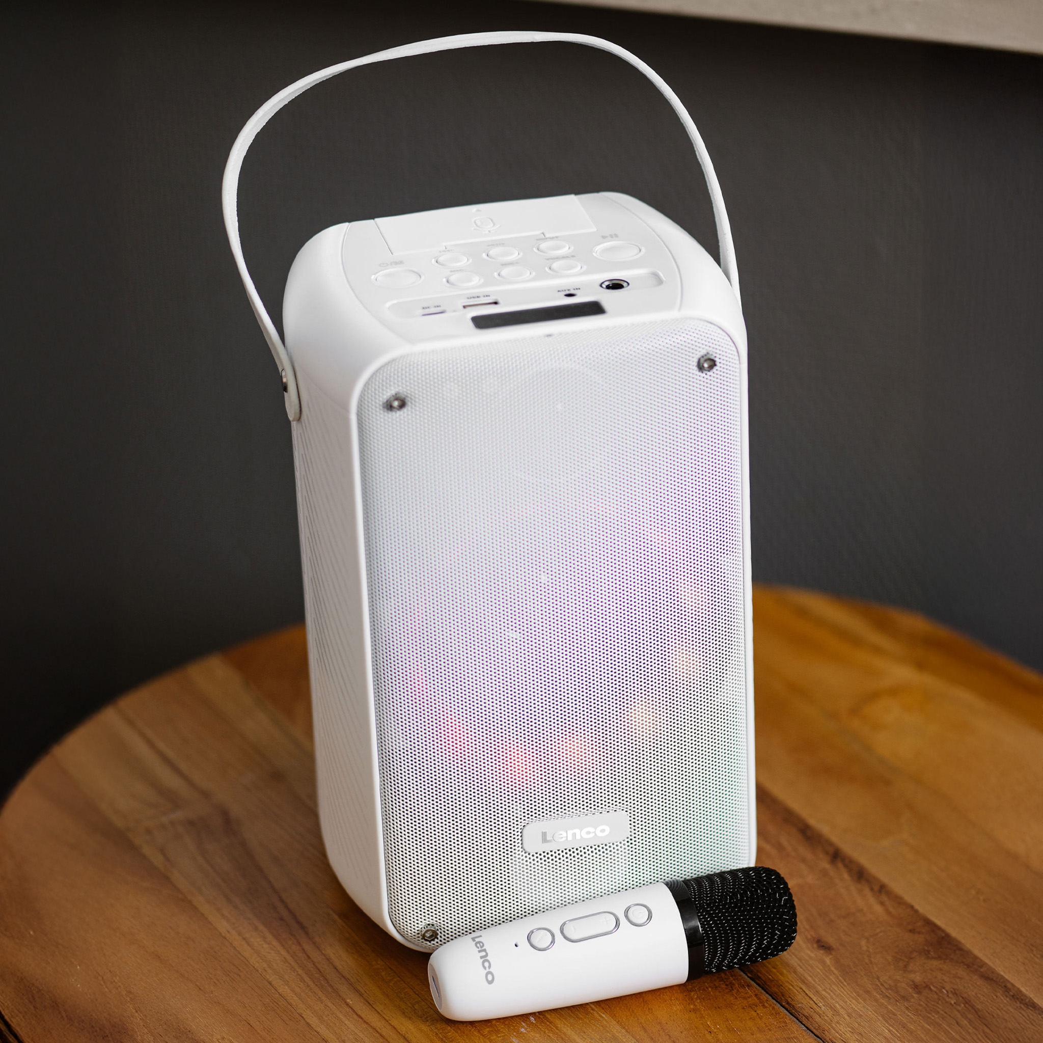 De BTC060WH is een ideaal toestel voor wie op zoek is naar een betaalbaar en eenvoudig karaokesysteem. Het compacte formaat maakt het gemakkelijk om in eender welke kamer te plaatsen en dankzij de ingebouwde LED-discolampen breng je meteen wat extra feestverlichting in de ruimte. Je hoeft geen ingewikkelde instellingen te doen: verbind je speaker gewoon via Bluetooth met je smartphone of tablet, en je kan meteen beginnen zingen.